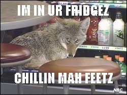 Im in ur fridges chillin mah feets | Adrian the Chicago Quizno’s CoyoteRemember the Quizno’s Coyote? On an ordinary April afternoon, the patrons of the downtown Chicago sandwich shop were treated to a surprise visit by a wild coyote who attempted to jump the counter but decided to settle into the beverage cooler instead. Animal control took him away, named him Adrian and set him back into the wild, but not before he captured a bit of fame and made for a new addition to the “IM IN UR” photo-chop internet meme.