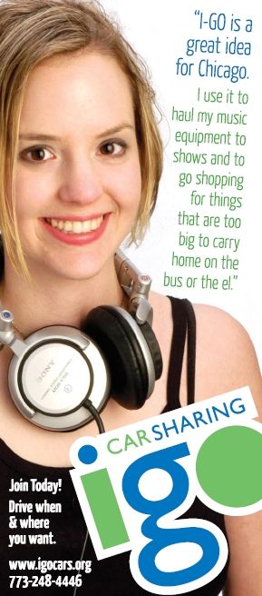 igo poster girlSo I’m now the “poster girl” of sorts for iG0–it’s a nonprofit car sharing program in Chicago (and in other cities as part of the Flexcar network). You pay by the hour at a rate depending on the plan you choose, and you never have to pay for gas or insurance–it’s AWESOME.